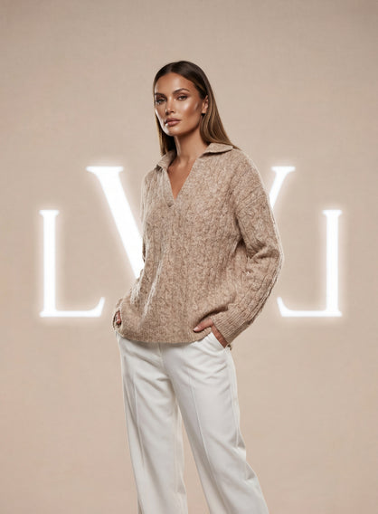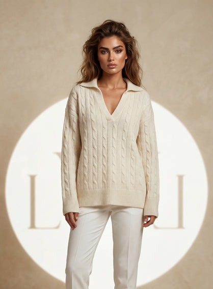 Ekru Polo Yaka V Kesimli Kadın Triko Bluz/Kazak