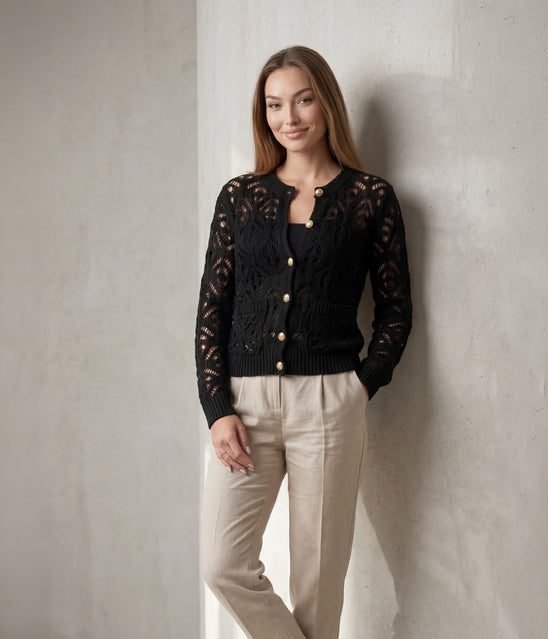 Altın Düğmeli Siyah Ajurlu Mevsimlik Triko Hırka