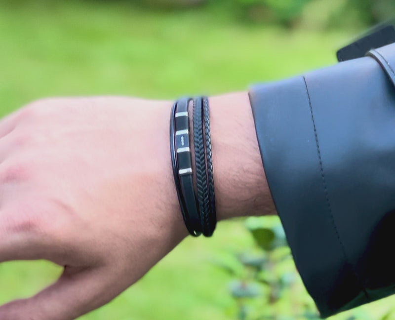 Siyah 4 İpli Örgü Deri ve Metal Detaylı Erkek Bileklik