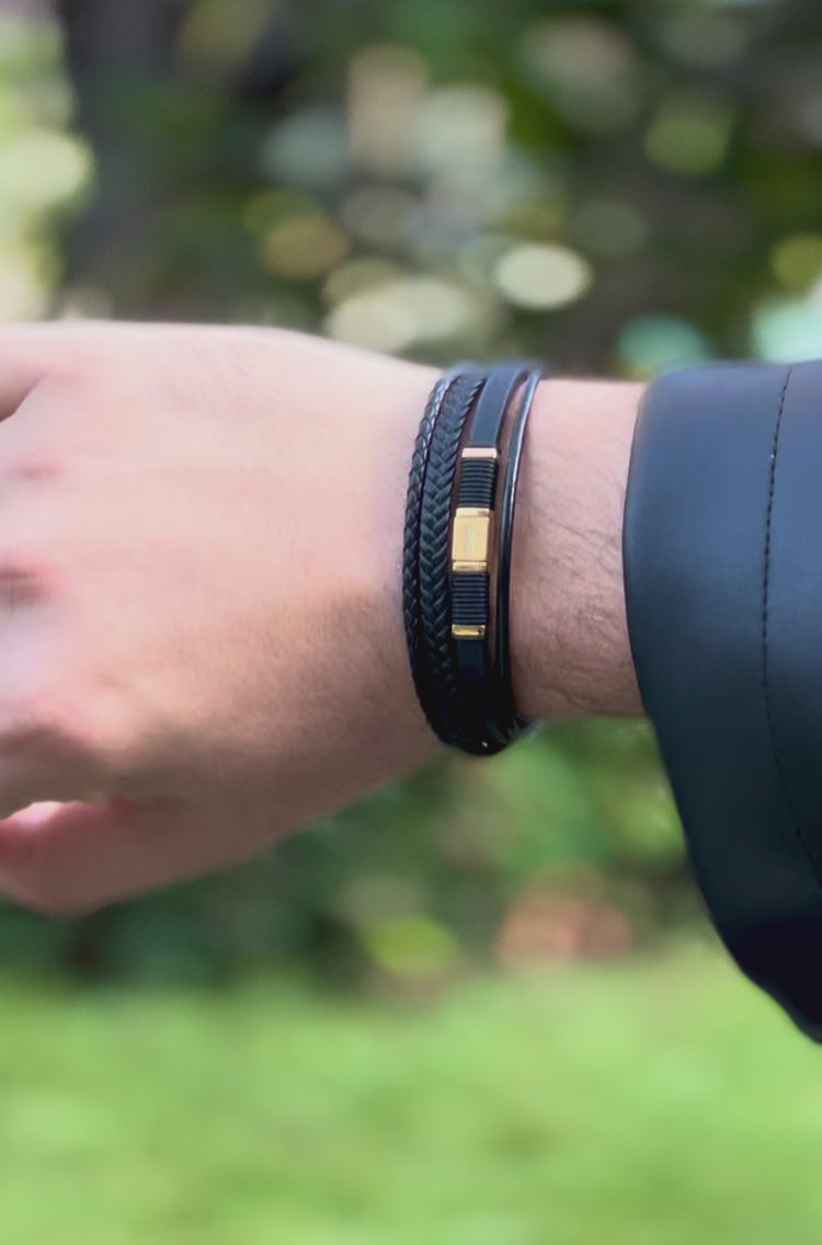 Siyah 4 İpli Örgü Deri ve Gold Metal Detaylı Erkek Bileklik