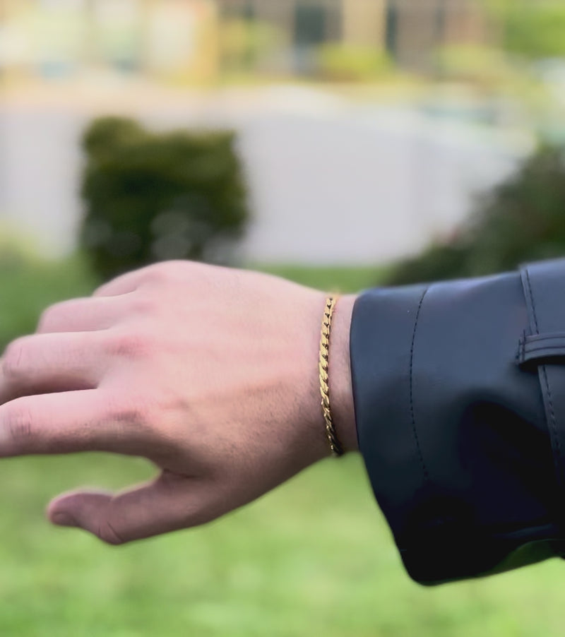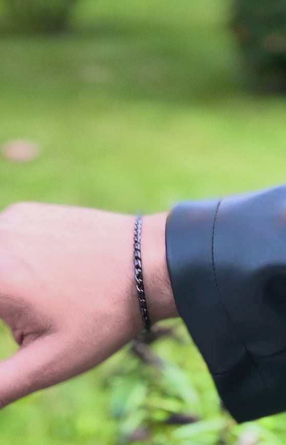 Gizemli ve modern bir dokunuş! Bu siyah renkli erkek bilekliği, ince, yassı ve hafif burgulu (halat/ip zincir görünümlü) yapısıyla stilinize zarif bir karakter katar. Zincirin özel tasarımı, klasik yuvarlak zincirlerden farklı bir doku sunarak ışığı zarifçe yansıtır ve mat bir parlaklık oluşturur. Minimalist tarzı sayesinde tek başına kullanıldığında sade ve sofistike bir görünüm sağlarken, diğer bileklik ve saatlerle kullanıldığında ise mükemmel bir katmanlama parçası olur. Hem günlük kullanım hem de özel anlar için ideal, zamansız bir aksesuardır.