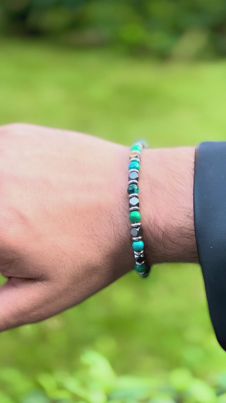 Stilinize karakter ve renk katın! Turkuaz ve koyu yeşil tonlardaki doğal taşlar ile metalik siyah/gri boncukların mükemmel uyumuyla tasarlanan bu erkek bilekliği, günlük ve şık kombinleriniz için ideal bir aksesuardır. Bileklik, modern ve maskülen bir görünüm sunarak bileğinizde zarif bir detay oluşturur. Esnek yapısı sayesinde kolayca takıp çıkarılabilir ve bileğinizde konforlu bir şekilde durur. Tek başına veya saatinizle birlikte katmanlı olarak kullanabilirsiniz.